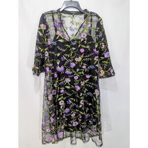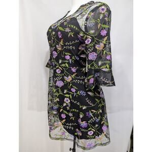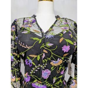 NWT Kensie dress. Black mesh overlay with floral embroidery. Adjustable straps, sheer bell sleeves, lined body, and gold charm tag.