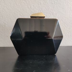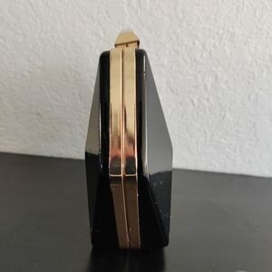 Elegant black hexagonal clutch by Kensie. Features a unique geometric design with a gold clasp. 5" length 8" height 3" width