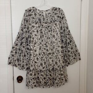 Kensie Black & White Toile Print Ruffle Shift Dress, long semi sheer bell sleeves, dress is chiffon outer layer over solid white inner lining. Feminine, contemporary, for party, dinner out, casual occasions.