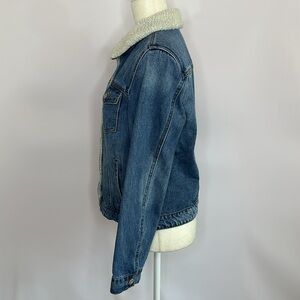 Stay stylish and warm with this Kensie blue denim jacket featuring a cozy faux sherpa collar. Perfect for casual outings. Button front. Four front pockets. Women’s size Medium.