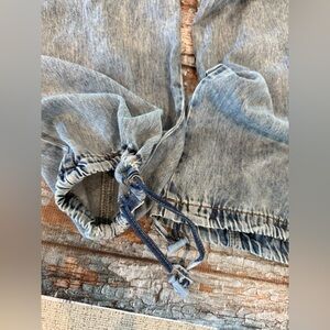 Stylish and comfortable light blue jeans, perfect for casual wear. Soft lightweight like a chambray . These pants are awesome. Rise 11 /2 inseam 28 . The ankles can cinch . ** the waist button is a little loose .