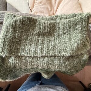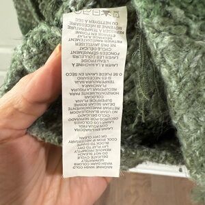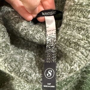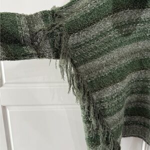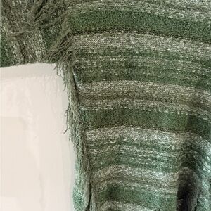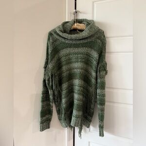 Excellent used condition. Boho green striped Kensie sweater with a cowl neck and fringe details. Perfect for layering. Size small but oversized. Unique-looking. From a smoke-free environment.