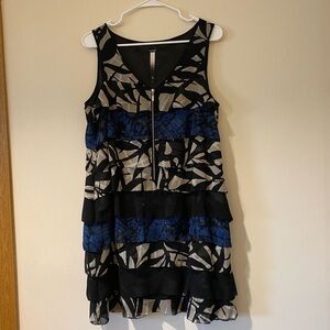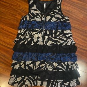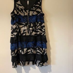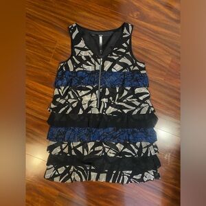 Kensie Stylish sleeveless mini dress with tiered layers. Features a bold black and blue pattern. Perfect for casual outings. Great condition size large