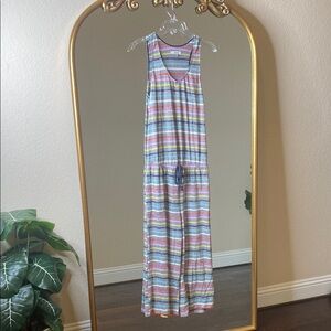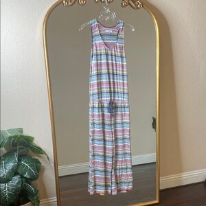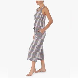 Kensie - Sleeveless Knit Lounge Romper - Grey Striped Vibrant striped romper with a relaxed fit. SLEEVELESS, ROUND NECKLINE, DRAWSTRING, SIDE POCKETS, WIDE LEG Perfect for casual outings.