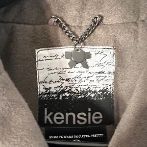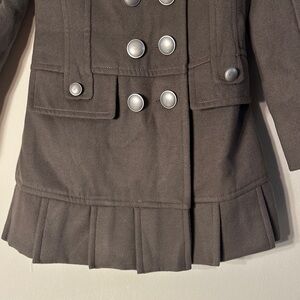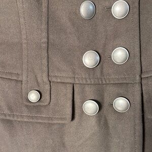 Chic double-breasted design with pleated hem. Stylish silver buttons add elegance.