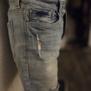 Stylish faded blue denim shorts with a distressed design. Perfect for casual wear.
