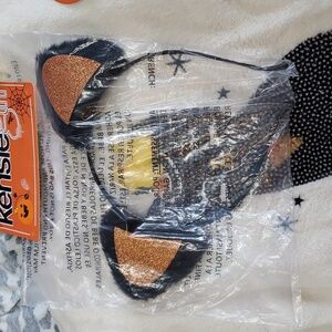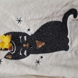 Plush inside and out long sleeve top with smiling sequined black cat in the center