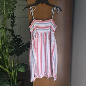 Kensie Girl playful pink and blue striped sundress. ties at shoulders and on front pockets. smocked bodice and crinkle material skirt. very sweet and light and nice for summer. very good used condition. only seeing a couple loose threads.