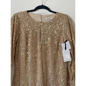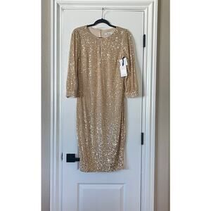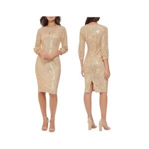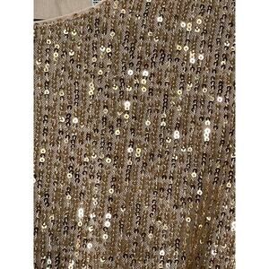 Shimmering gold sequin midi dress. Features shimmering gold sequin detailing. Elegant three-quarter sleeves. Perfect for evening wear or as a wedding guest. PTP 18 Total length 43.5