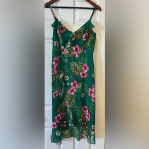 Say aloha to your new favorite dress! kensie's floaty chiffon look comes alive with the addition of a vibrant Hawaiian-inspired print.