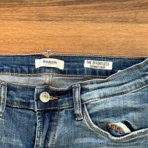 Stylish and comfortable, these Kensie women’s distressed jeans in size 6 feature a medium wash and a trendy effortless crop cut. With subtle distressing, they’re perfect for casual looks or pairing with your favorite sneakers or boots.