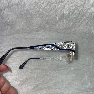 White with navy blue on sides. Fun design for some readers! Pre-loved condition with plenty of life left! Have wear throughout, darkening on nose pieces. These have prescription in them, and will need to be replaced with yours.