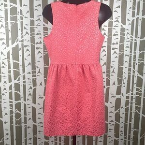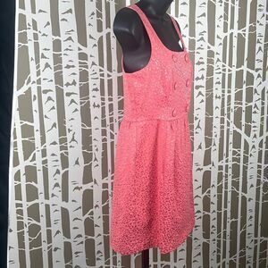Additional Details: Pretty coral pink textured shiny leopard print, 6 button accent on chest, fully lined, hidden zip back entry.