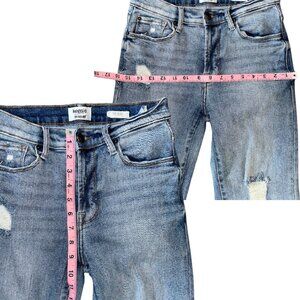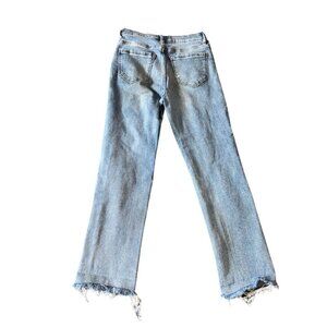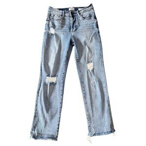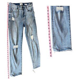 Trendy light blue skinny jeans. Distressed details. Frayed hem. Perfect for casual wear.