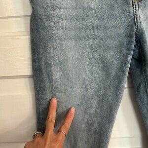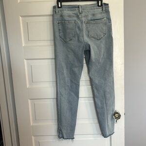 Stylish light blue jeans. Features classic five-pocket design. Frayed hem for a trendy look.