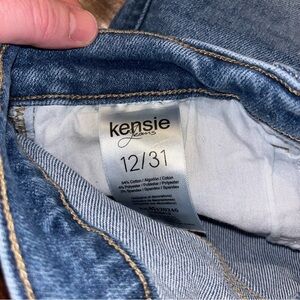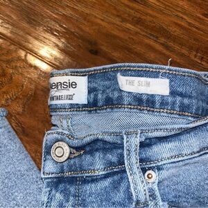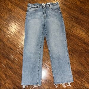 Stylish straight leg jeans. Light blue wash. Frayed hem detail. Classic five-pocket design.