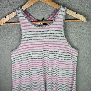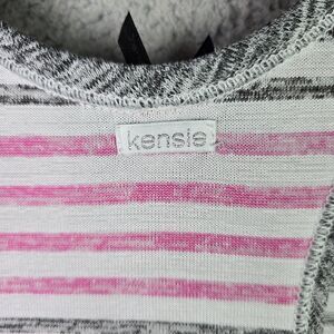 Step into summer with this Kensie striped racerback sundress, size M, featuring alternating thin stripes in white, light pink, and gray. The soft, stretchy rayon-blend fabric and slightly flared silhouette make it perfect for everything from beach days to casual outings or as a long tunic tank top. Side slits offer extra comfort and movement, while the Kensie logo on the back adds a signature touch. Approximate measurements: 18" pit to pit, 32" shoulder to hem. Excellent condition with no flaws. Pair with sneakers or sandals for a laid-back, fashion-forward look, or use as a stylish swim cover-up on your next getaway. Pre-owned in like new/ excellent condition.