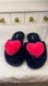 Plush navy slippers with a bold pink heart. Perfect for lounging.