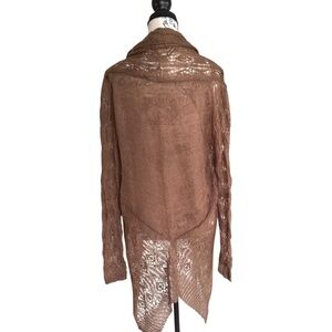 A gorgeous and versatile open-knit cardigan by Kensie. This piece features a rich, warm brown color and a breezy, intricate open-knit pattern, perfect for lightweight layering.