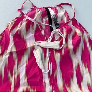 Stylish Kensie tank top. Features vibrant pink, tan and white pattern. Lightweight and comfortable. Perfect for casual wear or wear it under a blazer with jeans