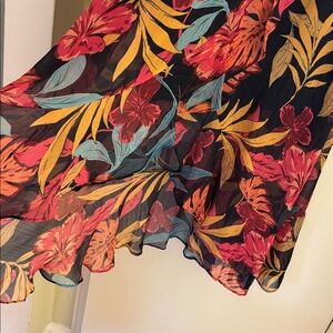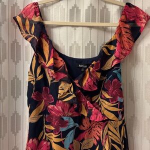 Chic dress with bold floral design. Features ruffled V Neck neckline, ruffles go down the middle. Hidden zipper on the left side. Lined.