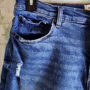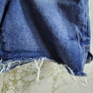 Size 10/30. 33 inch waist, 11 inch rise, 6.5 inch inseam. Cotton/elastane. Good distressed condition.