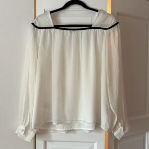 Kensie blouse, cream and black top, sailor collar blouse, Parisian style blouse, feminine work top, classic black trim blouse, relaxed fit blouse, chic neutral top, flowy office blouse, Kensie women’s top