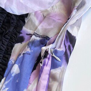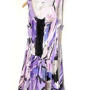 This beautiful Kensie dress showcases a vibrant purple abstract ink splatter print, accented with splashes of black, white, beige, and pink. A discreet 14-inch side zipper offers easy on-off. The black ruffle trim adds a feminine touch, running down the front and along the hemline. The dress is fully lined and has a relaxed, flowing skirt. It's perfect for casual outings, vacations or special occasions.