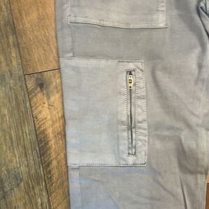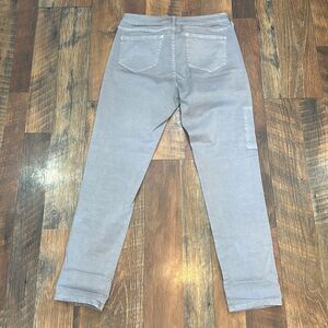 These light gray pants have stretched to them. The waist measures 15 inches across unstretched and the rise is 9 inches. The inseam measures 28 inches.