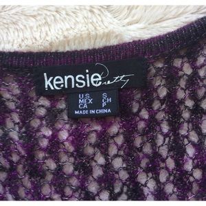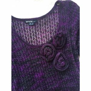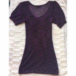 Purple multicolor knit short sleeve sweater. It is long. It can be seen through so need to wear a shirt underneath. Made in China. Very cute and unique.