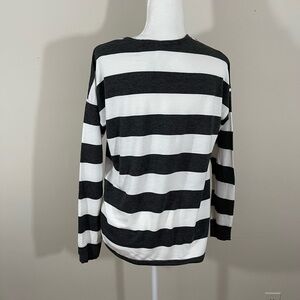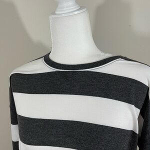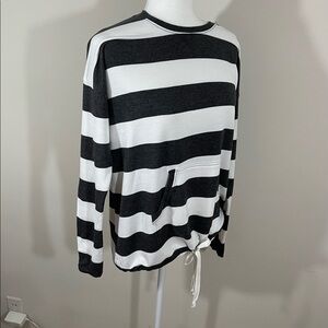 Crew neck style Long sleeves. Kangaroo pocket. Stripes in gray and white. Drawstring waist. Lightweight soft shirt EUC ver cute. Armpit to armpit measurement flatfold is 20 inches. Length from shoulders to hem about 25 inches. No visible flaws. Any questions please ask. Will answer questions as soon as possible. J