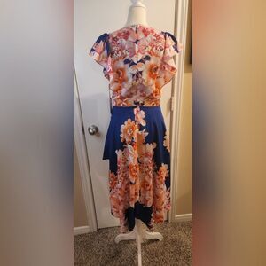Has a v neckline, ruffle short sleeves, asymmetrical layering at the bottom.