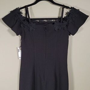 This adorable little black dress is off-the-shoulder with adjustable spaghetti straps. Cap sleeves with lace trim. Zip-up the back with hook & eye closure. Content: shell 95% polyester, 5% spandex; lining 100% polyester. Care: hand wash, dry flat.