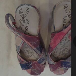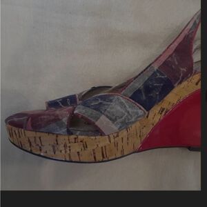 Fun colored wedge sling back adjustable sandal with cork inset. Red patent leather heel. Unique! Good condition