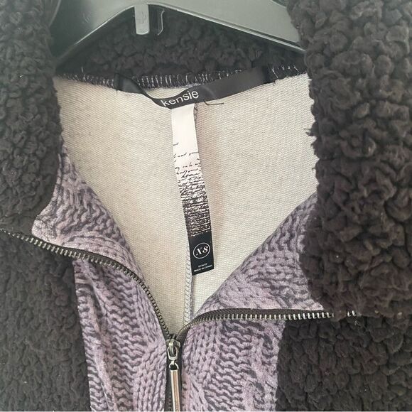 Sherpa lining on the collard. Stretchy thin material. Jersey like material. Draped. Pockets.