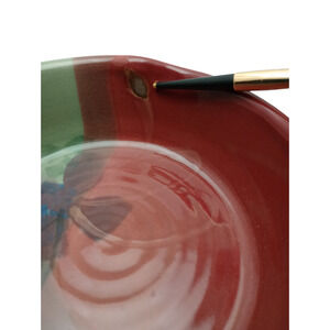 This is a Kent Follette pottery bowl in maroon and green glaze. It is 5.75" in diameter and 1.5" in height. There is a spot of glaze missing as pictured.