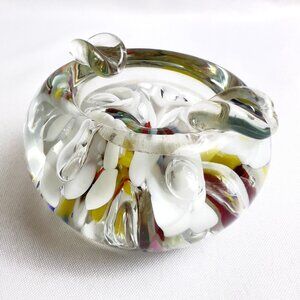 Bring a pop of artistry to your desk or display shelf with this stunning studio glass paperweight, featuring a mesmerizing multicolor floral suspended in crystal-clear glass. The radial design evokes abstract florals or a vibrant explosion, with hues of red, yellow, green, blue, purple, and white radiating from the center.