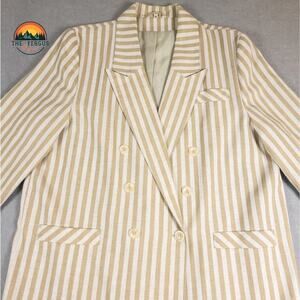 Kentucky Derby Collection women's size 18 tan and white striped blazer. Double-breasted, wide lapel, mid-length. Preppy Chic aesthetic: classic stripes, structured silhouette, refined style. Think polished elegance, timeless design, and perfect for adding a sophisticated touch to any ensemble. Ideal for events or smart-casual wear.