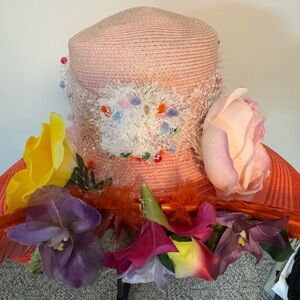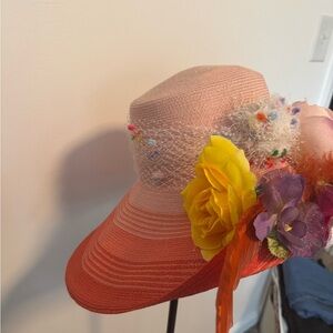 Elegant pink hat adorned with vibrant floral accents. Perfect for adding a touch of color to any outfit.