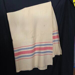 Kenwood Wool Products Virgin Wool Blanket Made in Canada Beige w Red Blue Stripe