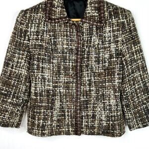Kenzie brown & white tweed blazer style jacket with built in small shoulder pads for structure, beaded floral/lace trim and lucite buttons. Size 6 or small. In great condition! Does have loops for a belt but there is no belt.