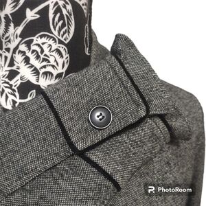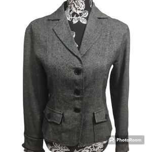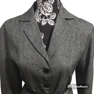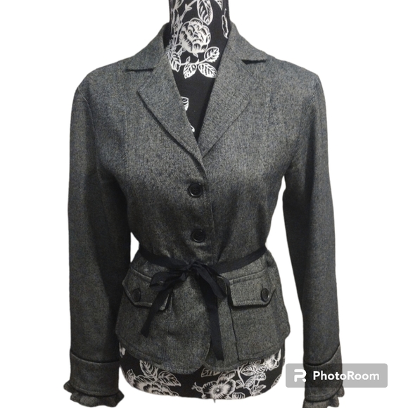 Gorgeous double breasted blazer. 3 button closure with removable ribbon tie. Ruffled cuffs. Functional side pockets.