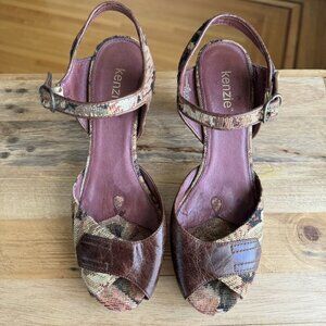 Kenzie Rachelle Burgundy Brocade Brown Platform Ankle Strap Peep Toe Sandal Size 8.5