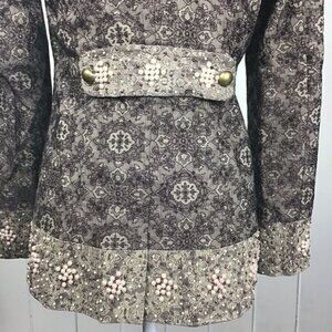 Kenzie brown button front blazer with Baroque style design. Blazer has gold buttons up the front & is embellished with pearls. Cuffs & collar have lace overlay & fabric has a light pinstripe pattern. Blazer has 2 front pockets and a slit center back. The jacket is in excellent shape and is simply beautiful!