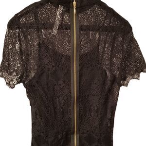 Black lace overlay, mock collar, hits above knee