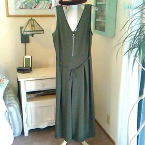 Such a very cool look! Olive green with a front zip. Ring pull. Ties come from behind to tie in front. Stitched down pleats in front, not in back. Midi length. Size L measures 42 at chest, 37 at waist, 50 at hips, inseam 22, 34 around at leg opening. Like NEW. The soft, woven fabric is elegant and classic.