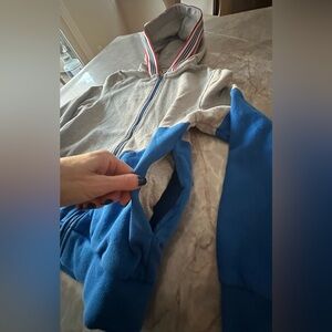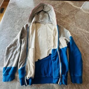 Blue & Gray zip up hoodie sweatshirt with blue, white & red trim detailing