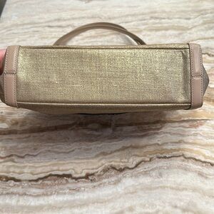 Gold cloth bag with beige leather straps and brown koi fish emblem