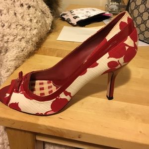 Multi colored peep toe pumps with red patent leather piping. Gently worn as seen in photo.