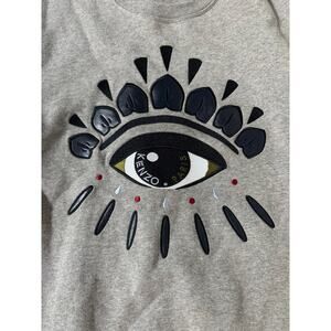 Very good preowned condition this Heather Gray sweatshirt by Kenzo Paris has beautiful and satiny embellishments of an eye that has the logo in the center. This is considered to be the all seeing eye. 100% cotton with a crewneck and long sleeves. It’s marked extra large however this runs slim and please look at the measurements which are taken flat in our as close as possible.